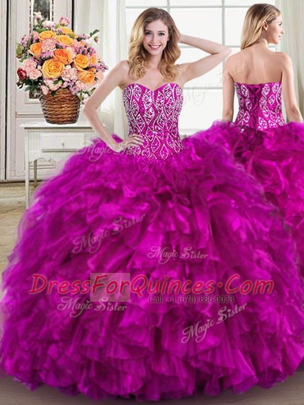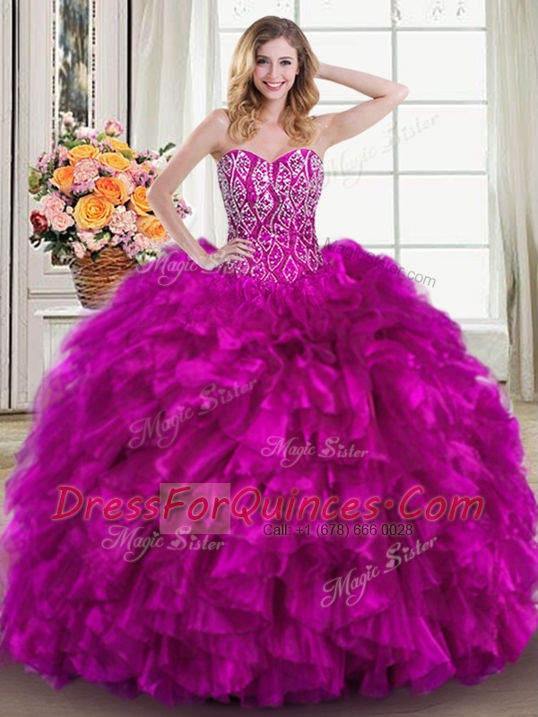 Beading and Ruffles Quince Ball Gowns Fuchsia Lace Up Sleeveless Brush Train