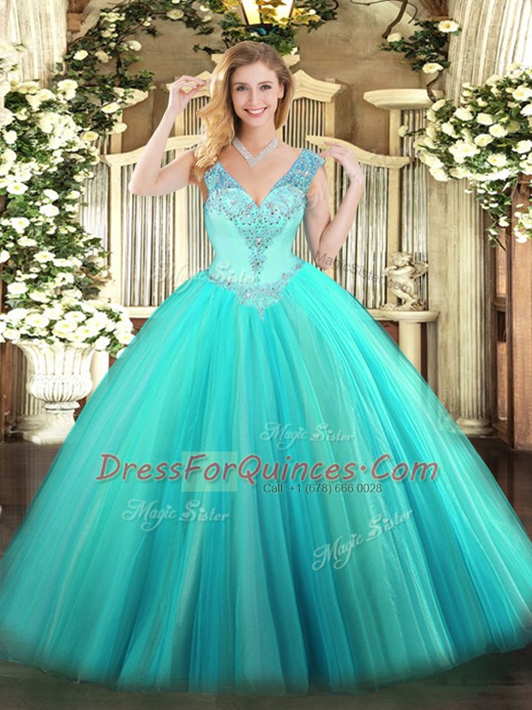 Best Selling Floor Length Lace Up Sweet 16 Dresses Aqua Blue for Military Ball and Sweet 16 and Quinceanera with Beading