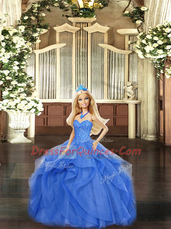 Blue Ball Gowns Sweetheart Sleeveless Organza Floor Length Lace Up Beading and Ruffles Vestidos de Quinceanera
