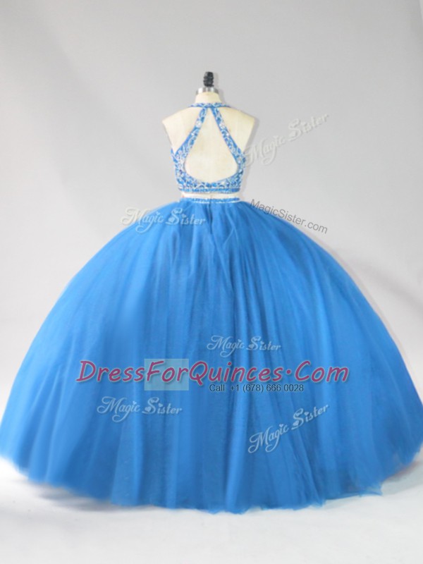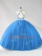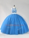 Blue Sleeveless Floor Length Beading Backless Quince Ball Gowns