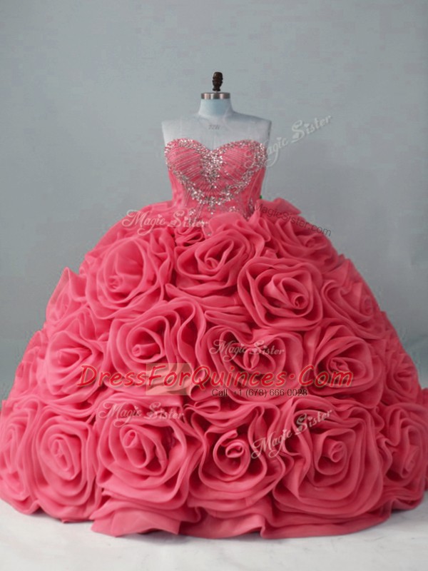 Coral Red Ball Gowns Sweetheart Sleeveless Fabric With Rolling Flowers Brush Train Lace Up Beading Vestidos de Quinceanera