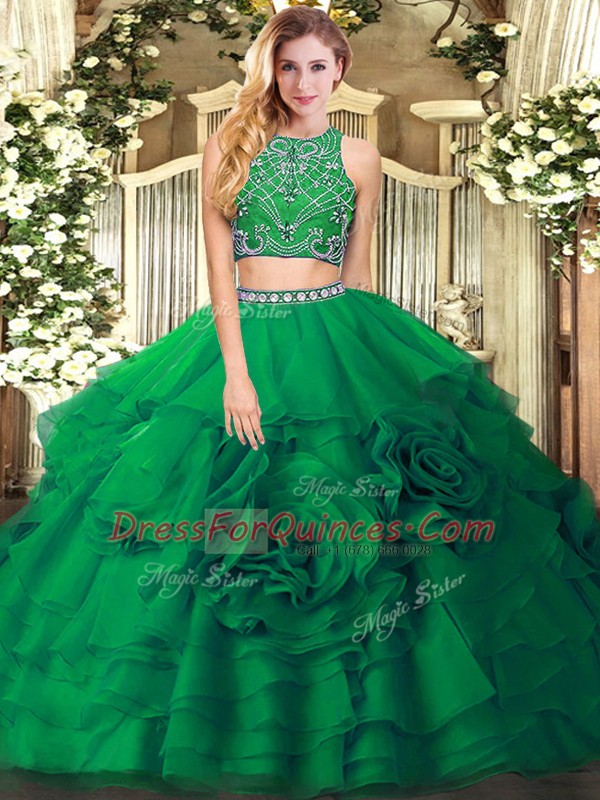 Customized Dark Green High-neck Zipper Beading and Ruffled Layers Quinceanera Dresses Sleeveless