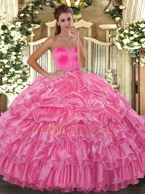 Discount Rose Pink Sleeveless Organza Lace Up Sweet 16 Dress for Military Ball and Sweet 16 and Quinceanera
