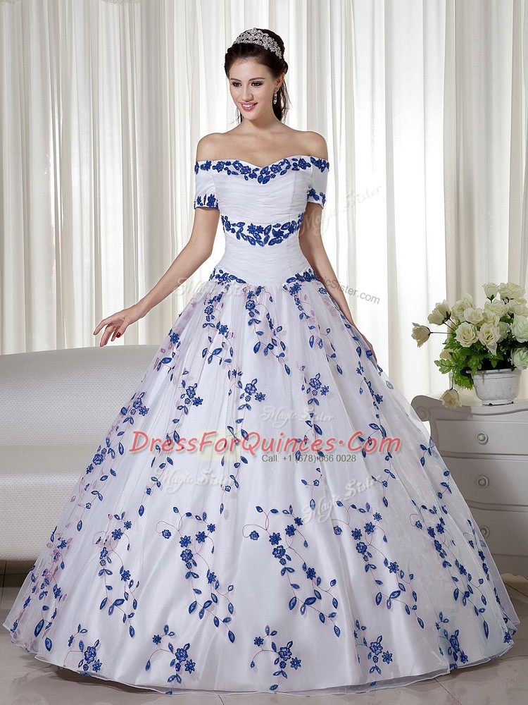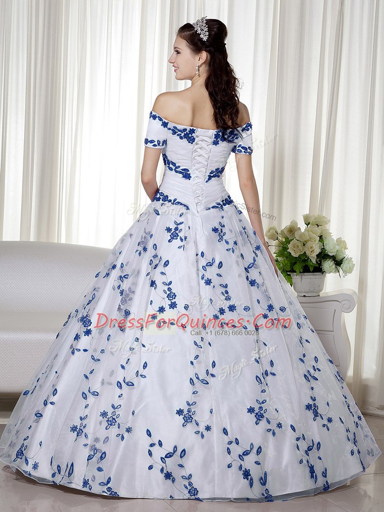 Dramatic Floor Length White Quinceanera Dresses Organza Short Sleeves Embroidery