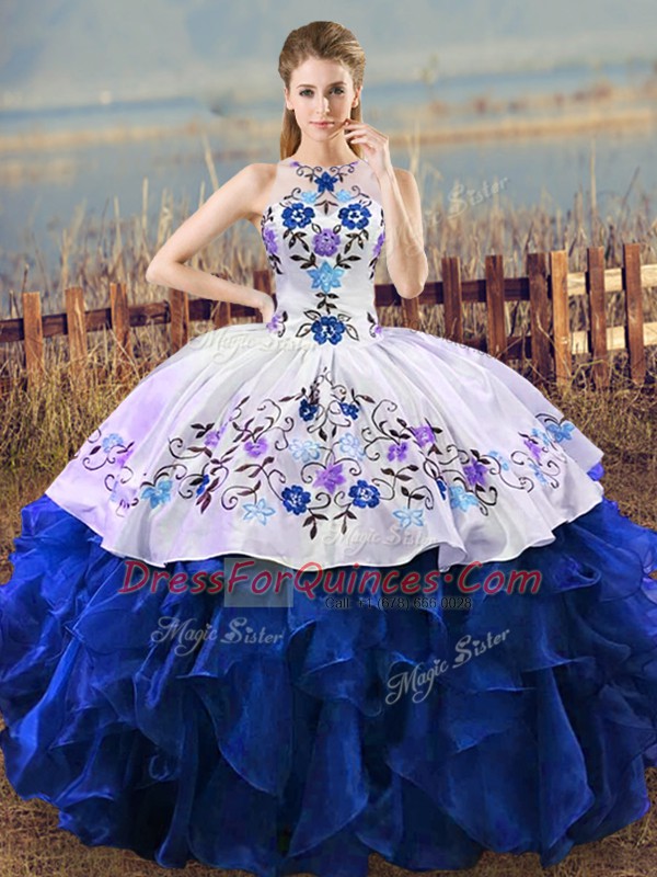 Extravagant Blue And White Halter Top Neckline Embroidery and Ruffles Quinceanera Dresses Sleeveless Lace Up