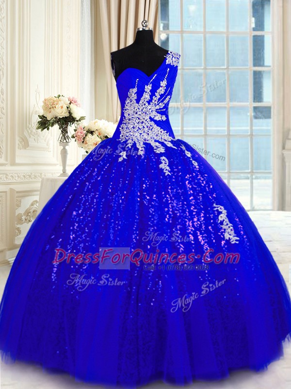 Fancy Ball Gowns Quinceanera Gown Royal Blue One Shoulder Tulle and Sequined Sleeveless Floor Length Lace Up