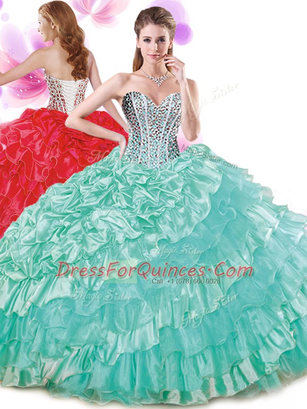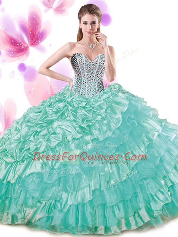 Floor Length Lace Up Sweet 16 Dresses Turquoise for Military Ball and Sweet 16 and Quinceanera with Beading and Ruffled Layers and Pick Ups