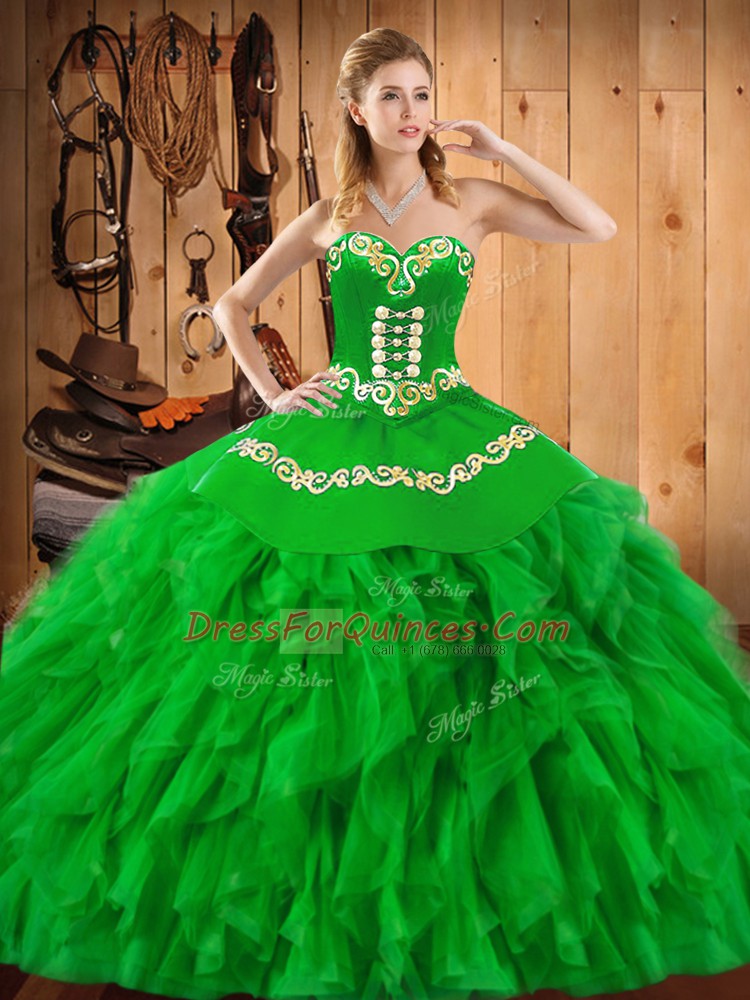 Green Satin and Organza Lace Up Sweetheart Sleeveless Floor Length Quinceanera Gowns Embroidery and Ruffles