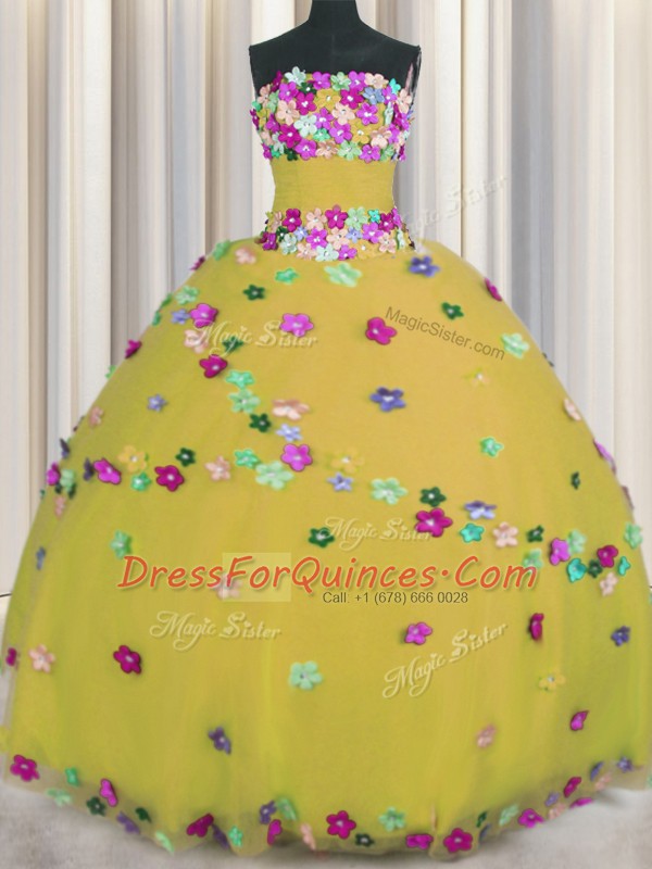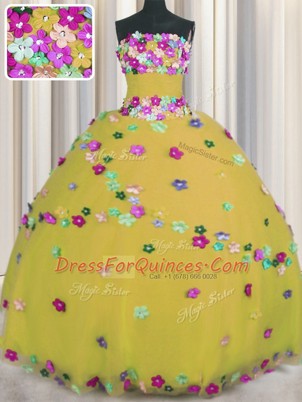 Hand Made Flower Quinceanera Dresses Gold Lace Up Sleeveless Floor Length