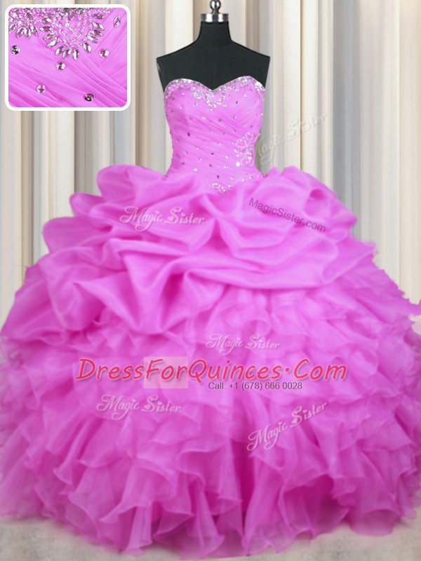 Lilac Ball Gowns Beading and Ruffles and Sequins and Ruching Ball Gown Prom Dress Lace Up Organza Sleeveless Floor Length