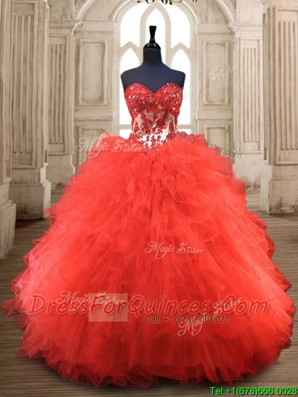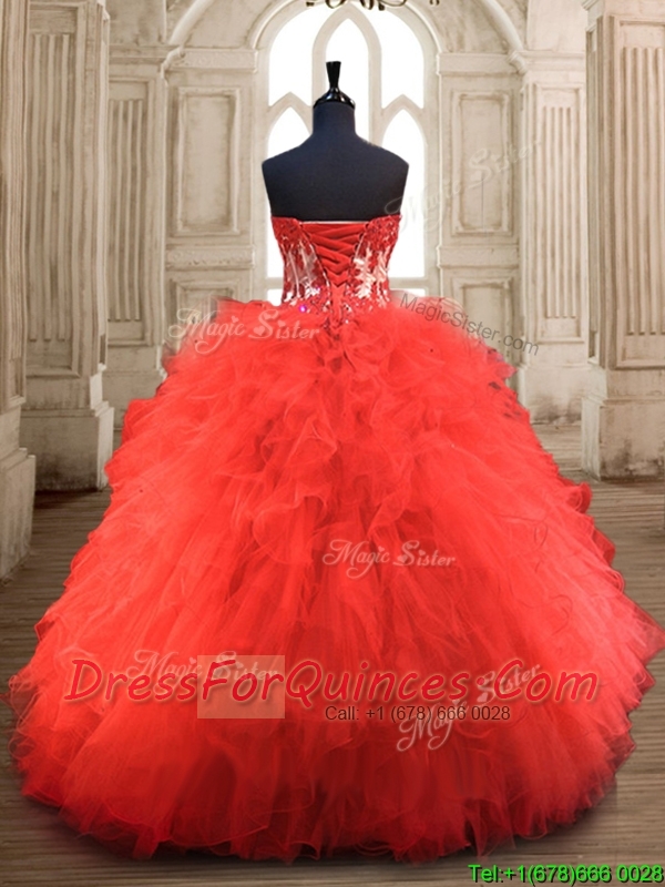 Popular Red Really Puffy Quinceanera Gown with Appliques and Ruffles