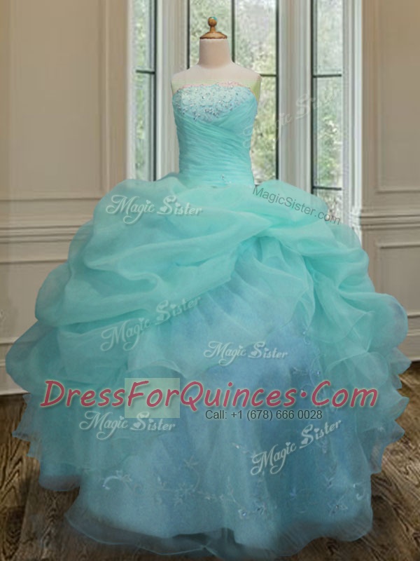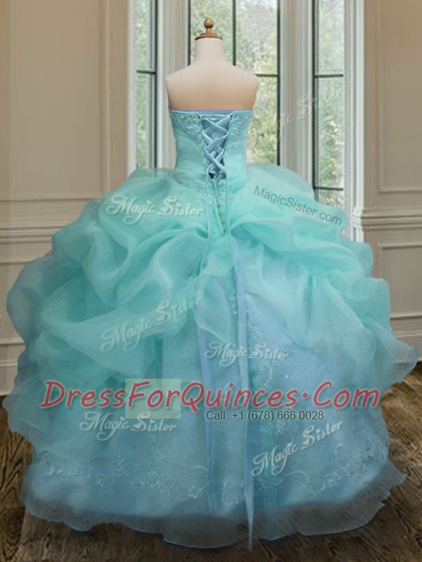 Popular Sleeveless Floor Length Embroidery and Pick Ups Lace Up Quinceanera Gown with Aqua Blue
