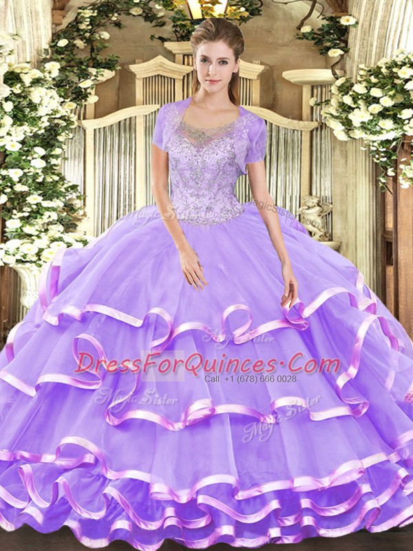 Romantic Lavender Lace Up Scoop Beading and Ruffled Layers Quinceanera Dress Tulle Sleeveless
