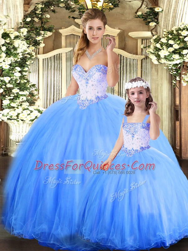 Sleeveless Floor Length Beading Lace Up Quince Ball Gowns with Blue